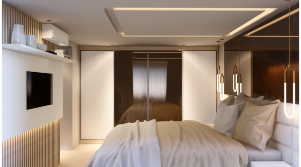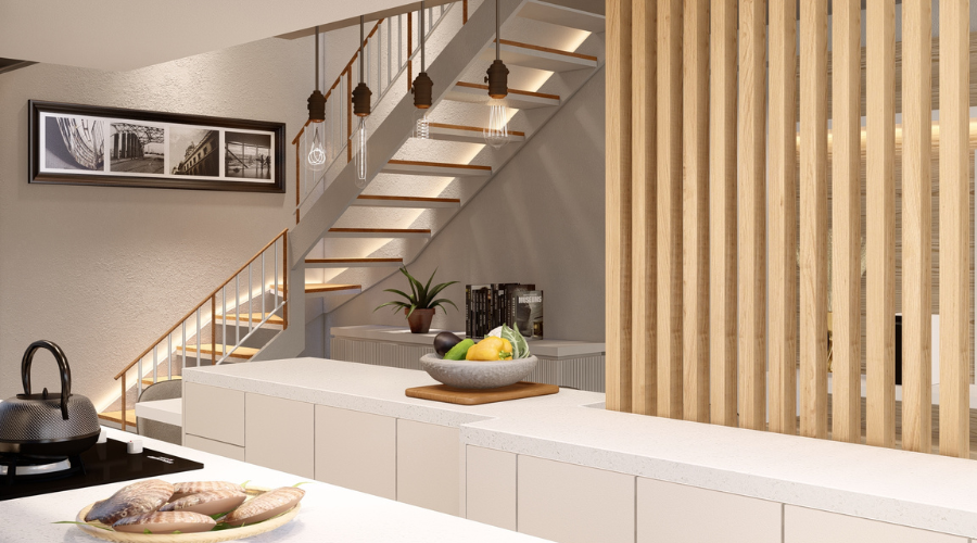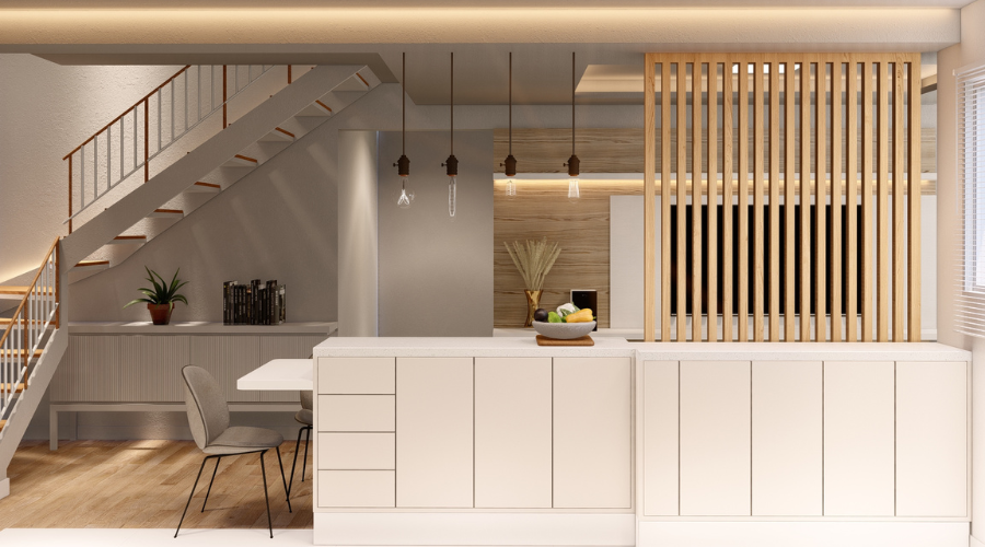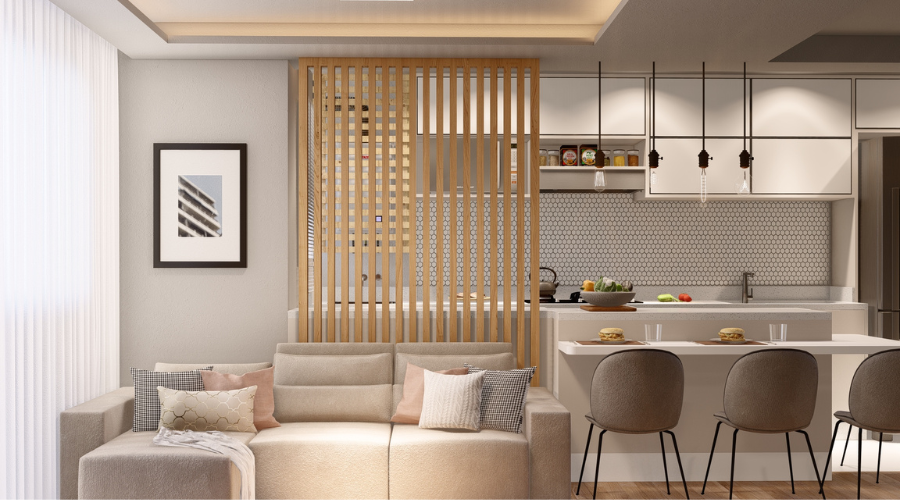 Projeto de cozinha e sala de estar integradas.