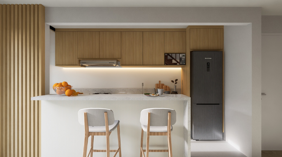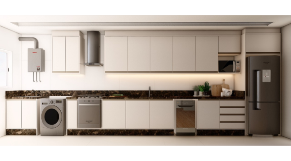 Uma cozinha moderna integrada com outros ambientes, como sala de estar ou de jantar favorece a convivência e a interação.