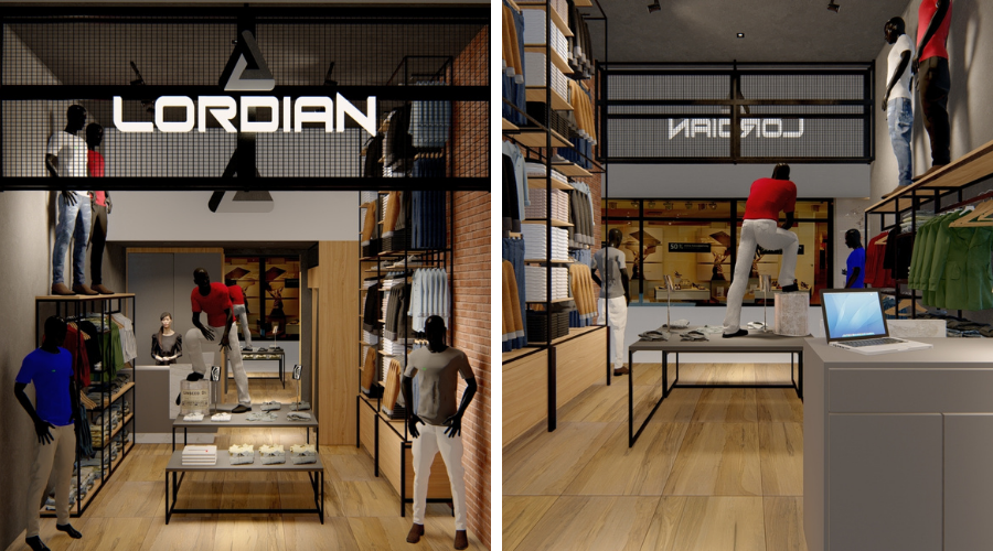 Projeto da loja Lordian (Moda Masculina) no Shopping Boulevard, localizado no Bairro Xaxim (Curitiba/PR). Espaço interno com área útil de 24 m². A distribuição da mobília foi planejada para que todos os espaços fossem utilizados da melhor forma possível. Piso no tom amadeirado, araras metálicas e MDF carvalho e cinza.