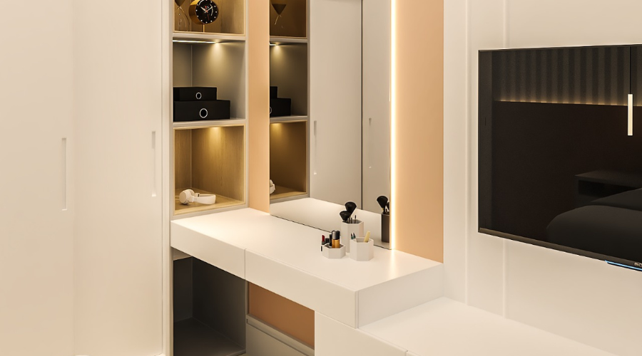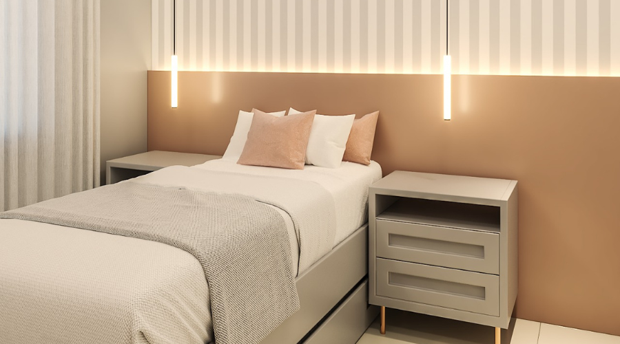 Projeto de quarto de solteiro com aproveitamento 100% do espaço, com lugar para televisão e bancada para fazer maquiagem. Tudo muito clean para valorizar e ampliar o espaço. Projeto idealizado para um cliente no Bairro Santa Felicidade em Curitiba, Paraná.
